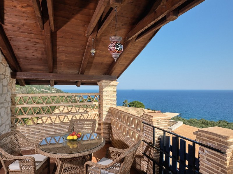 2 Bedrooms Deluxe Suite with Sea View features two bedrooms, each equipped with two single beds that can be combined into queen-sized ones. Additionally, one bedroom has an en-suite bathroom with a round bathtub. In the spacious living room, one will find two single sofa-beds. There is also an extra bathroom with a shower, a fully equipped kitchen and a furnished balcony with a wonderful view of the Ionian Sea.